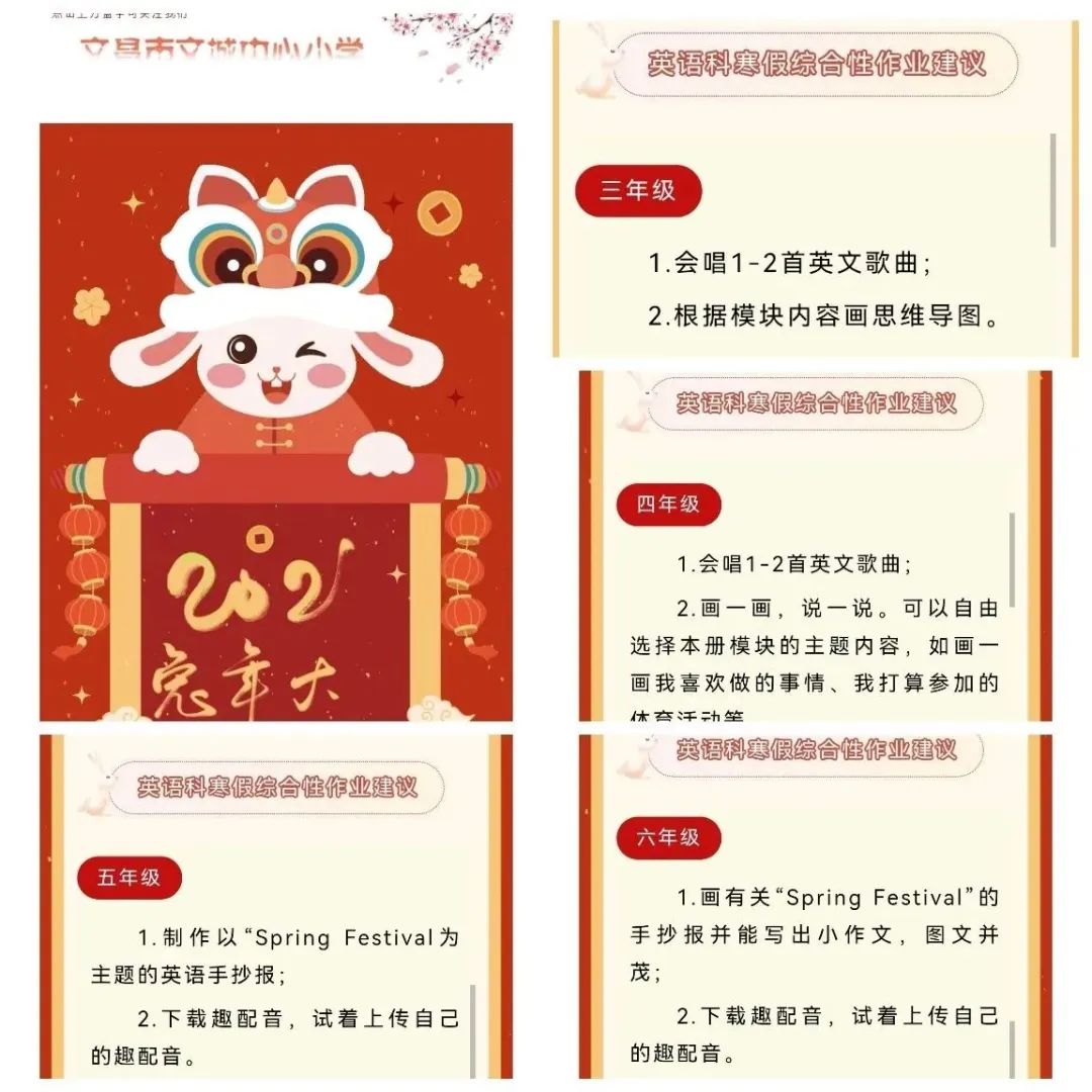 为了使孩子们的寒假生活更加丰富多彩,促进孩子们英语学习的兴趣,文昌市文城中心小学英语组为孩子们精心设置了寒假特色作业。