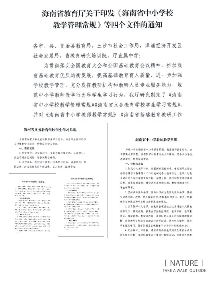 “四个常规”的内容覆盖中小学校教育教学的各个主体、各个环节,包括《海南省中小学校教学管理常规》《海南省中小学教师教学常规》《海南省基础教育教研工作常规》和《海南省义务教育学校学生学习常规》。