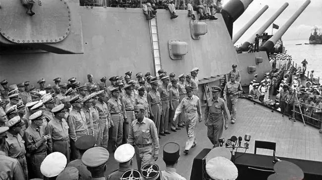 停泊于东京湾的美国战列舰“密苏里”号上举行向同盟国投降的签降仪式。