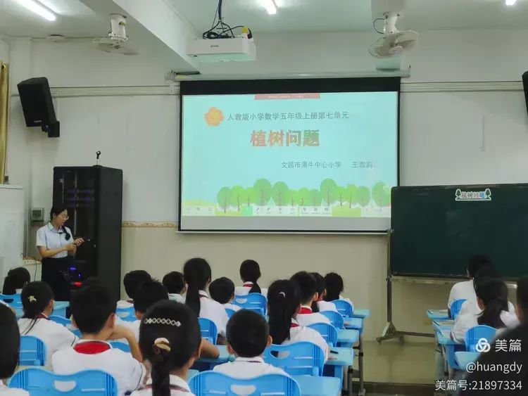 第二节课由潭牛中心小学王雪莉老师执教的五年级《植树问题》,王老师首先通过复习一条线段有几个端点再到复习平均分的知识,让学生在已有的知识经验中学习新知识。在教学新授环节,王老师亲切随和的教态迅速拉近与学生的距离。这堂《植树问题》课让学生在实践与探索中理解了数学知识,将抽象的数学概念具象化,让他们感受到了数学源于生活又应用于生活的真谛。