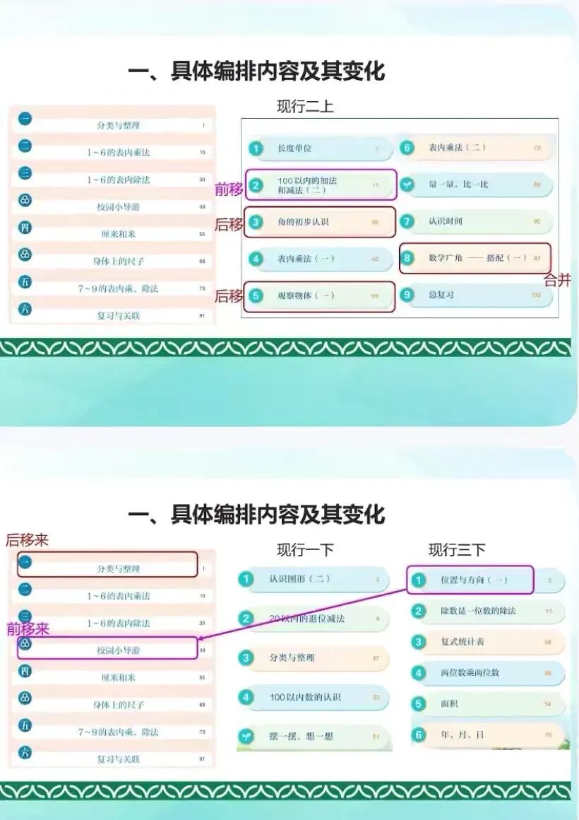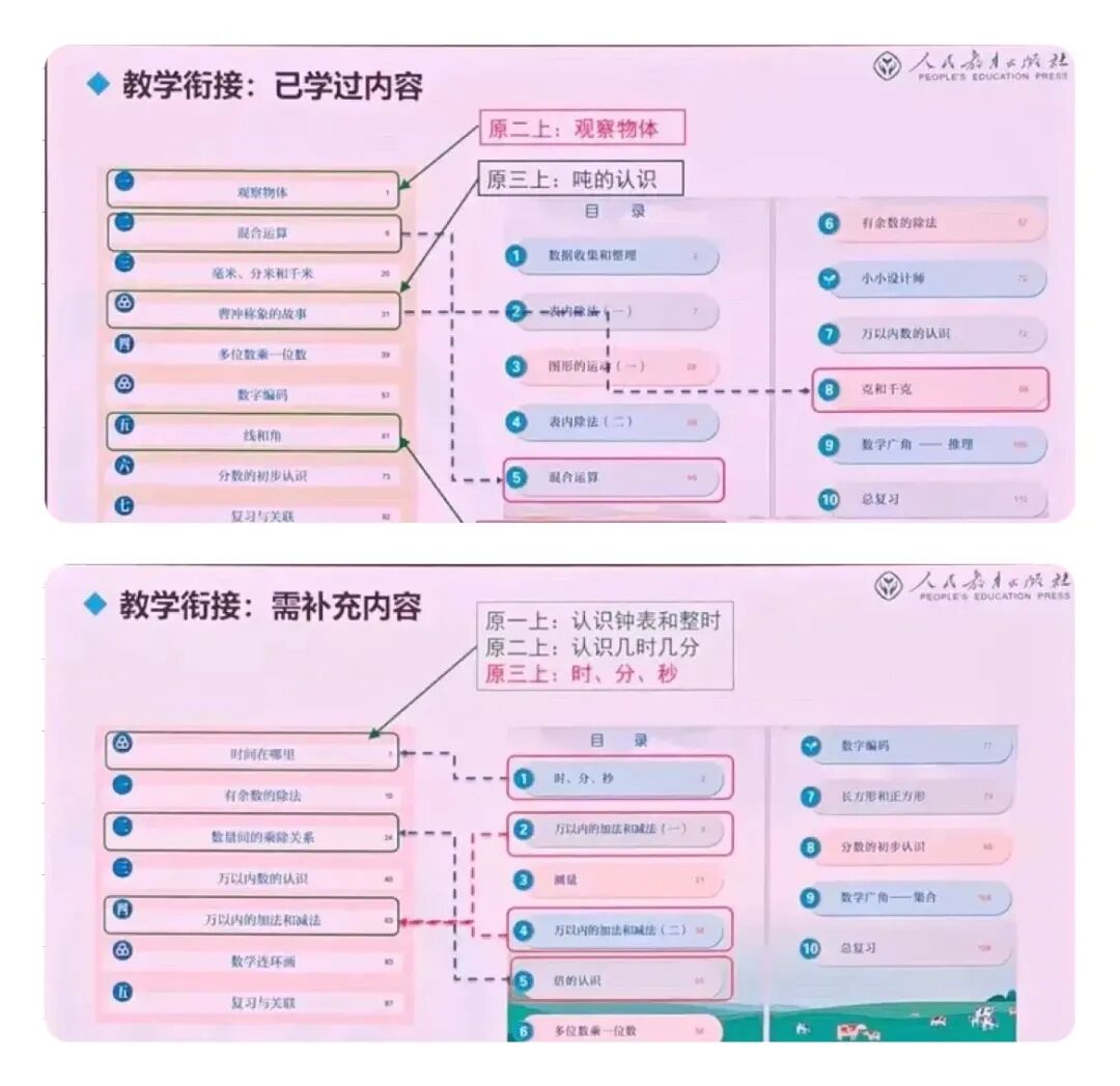 对于三年级来说,教师们做好三年级教学衔接工作,收集三年级“时 分 秒”、“倍的认识”、“万以内的加减法”的补充教学内容。三年级要让学生们理解数量关系,主动发现并提出问题;教师要重视图示教学,加强方法指导。