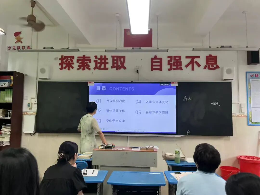 培训现场,林主任强调新教材以《义务教育数学课程标准(2022年版)》为指导,突出核心素养导向,强调“三会”目标——会用数学的眼光观察现实世界,会用数学的思维思考现实世界,会用数学的语言表达现实世界。教材在内容编排上体现“结构化、一致性、螺旋式”特点。林主任主要从新旧教材的目录结构对比、整体重要变化、变化要点解读、各章节具体变化及各章节教学安排这五个方面进行培训。