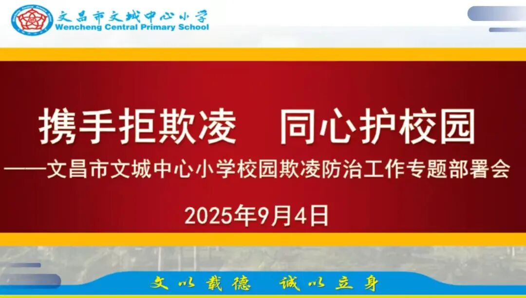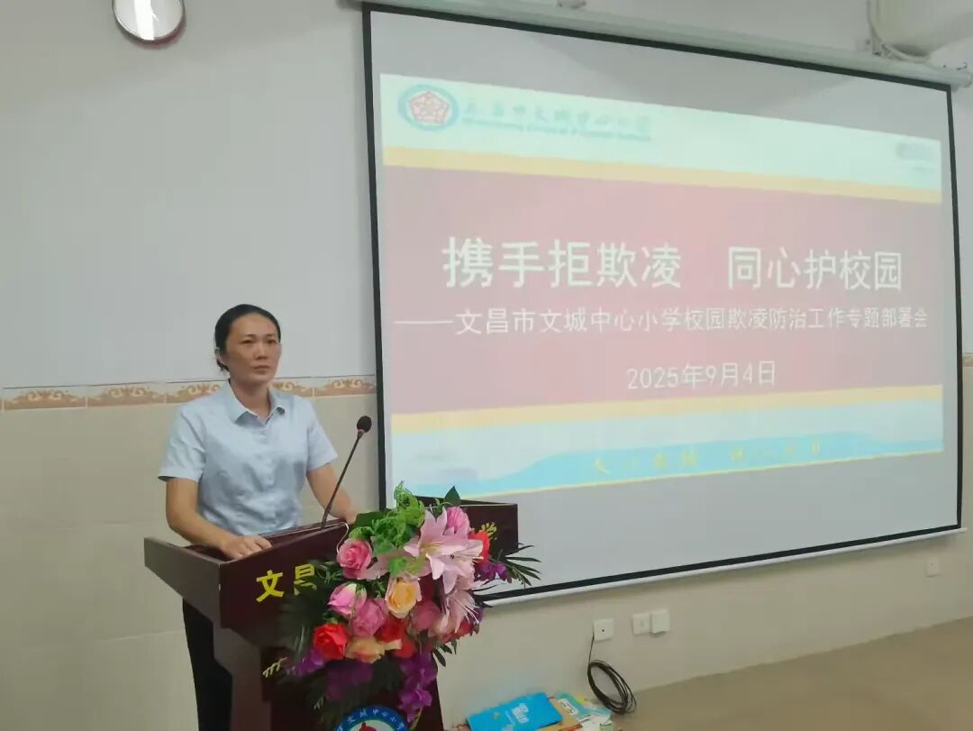 为落实校园安全工作要求,文昌市文城中心小学于9月4日下午召开学生欺凌防治工作专题部署会,本次会议由邢莲瑜主任主持,全体教师共同参与,旨在增强全体教师对校园欺凌的认识,落实防范措施,为学生营造安全、和谐的学习环境。