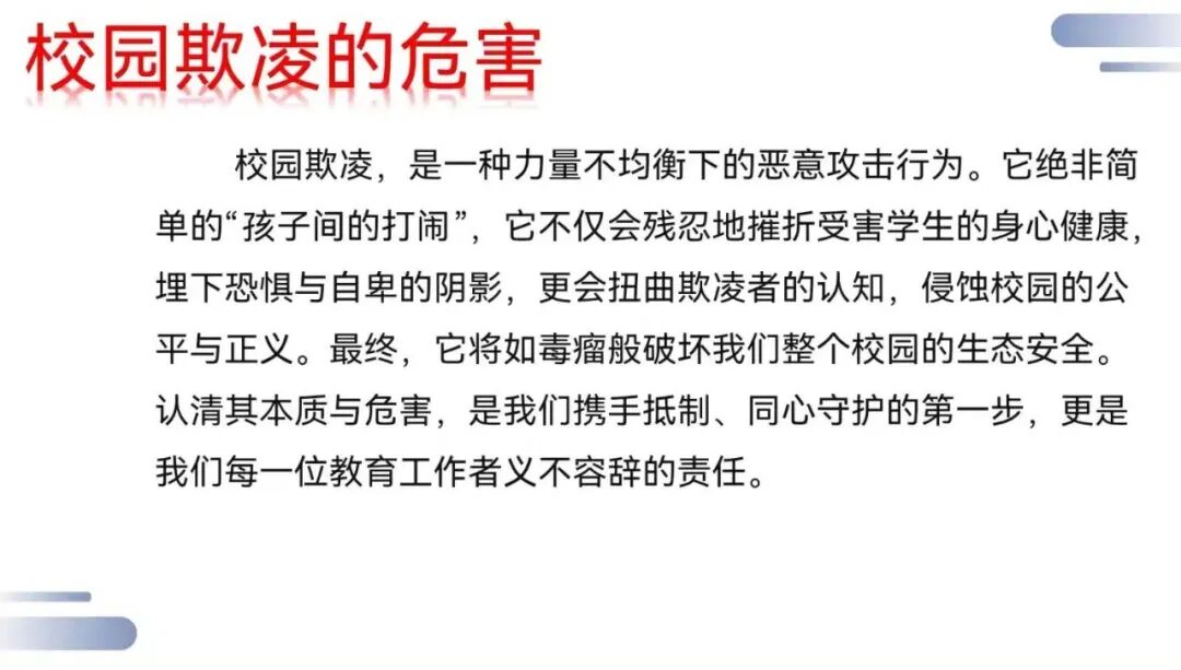 通过列举实际案例,详细阐述了肢体、语言、社交等不同形式的欺凌行为,让全体教师深刻认识到学生欺凌的多样性和复杂性。同时,还强调了学生欺凌对受害者身心造成的严重危害,不仅影响受害者的心理健康,导致自卑、抑郁、恐惧等心理问题,还可能对其学习和生活产生长期的负面影响。