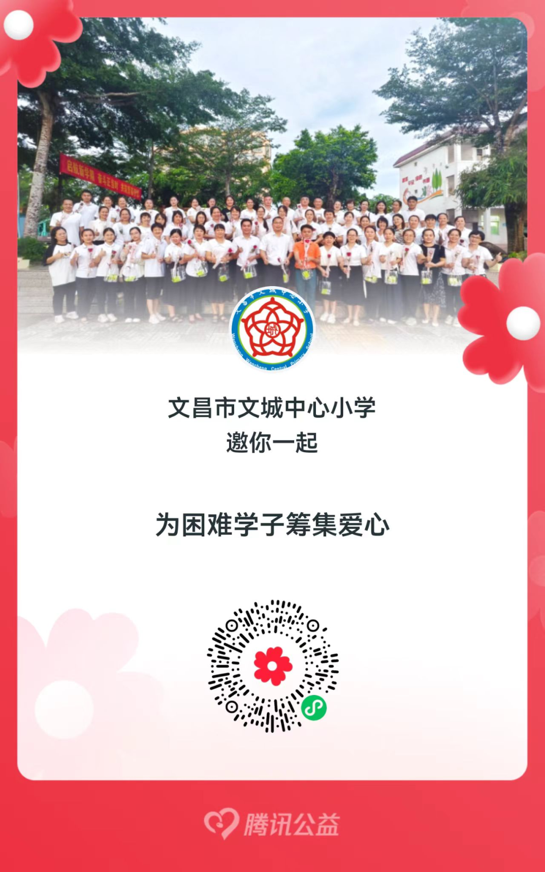 为积极响应2025年“放飞梦想·公益助学项目”久久公益节助学活动,我校将以“文昌市文城中心小学”名义组队,形成募捐链接。9月8—12日五天,每天上午10:00开始,在网上进行募捐(捐款数额最少1元,不定额)。我们每捐一次,将会得到腾讯、省慈善总会、市慈善总会的配捐(配捐的数额随机),捐的次数越多,得到的配捐也越多。本着“谁筹款,谁用款”的原则,凡是通过“文昌市文城中心小学公益助学项目”微信链接筹募到的善款和配捐,省市慈善总会将一分不留,全部奖给我校慈善会,由我校慈善会用于助学项目。