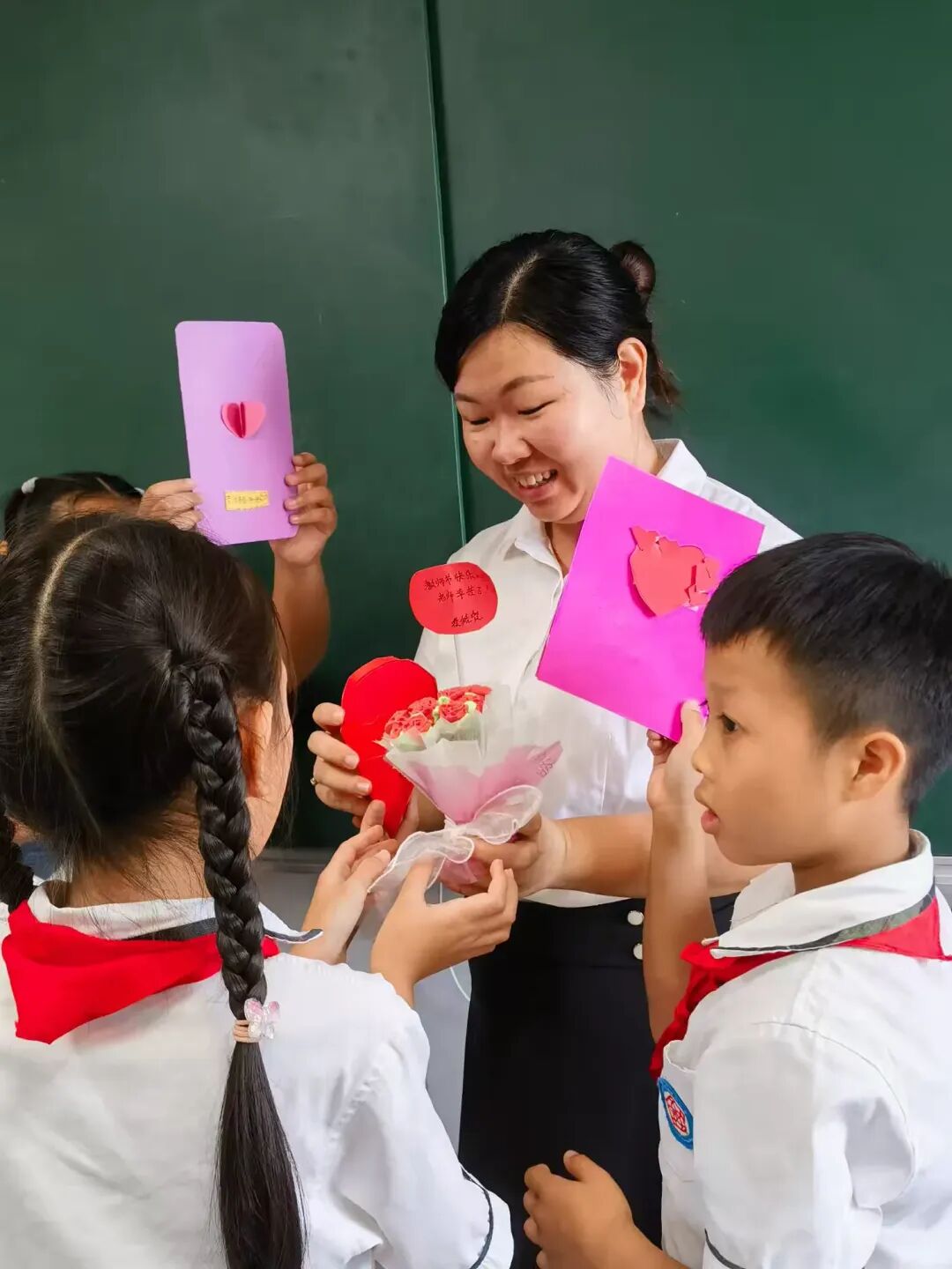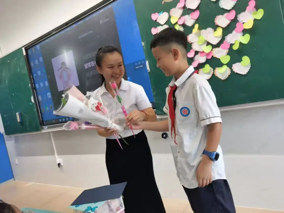 学生代表捧着亲手制作的感谢卡和手工作品,递到老师手中,卡片上歪扭的字迹、稚嫩的图案,都是最珍贵的礼物。