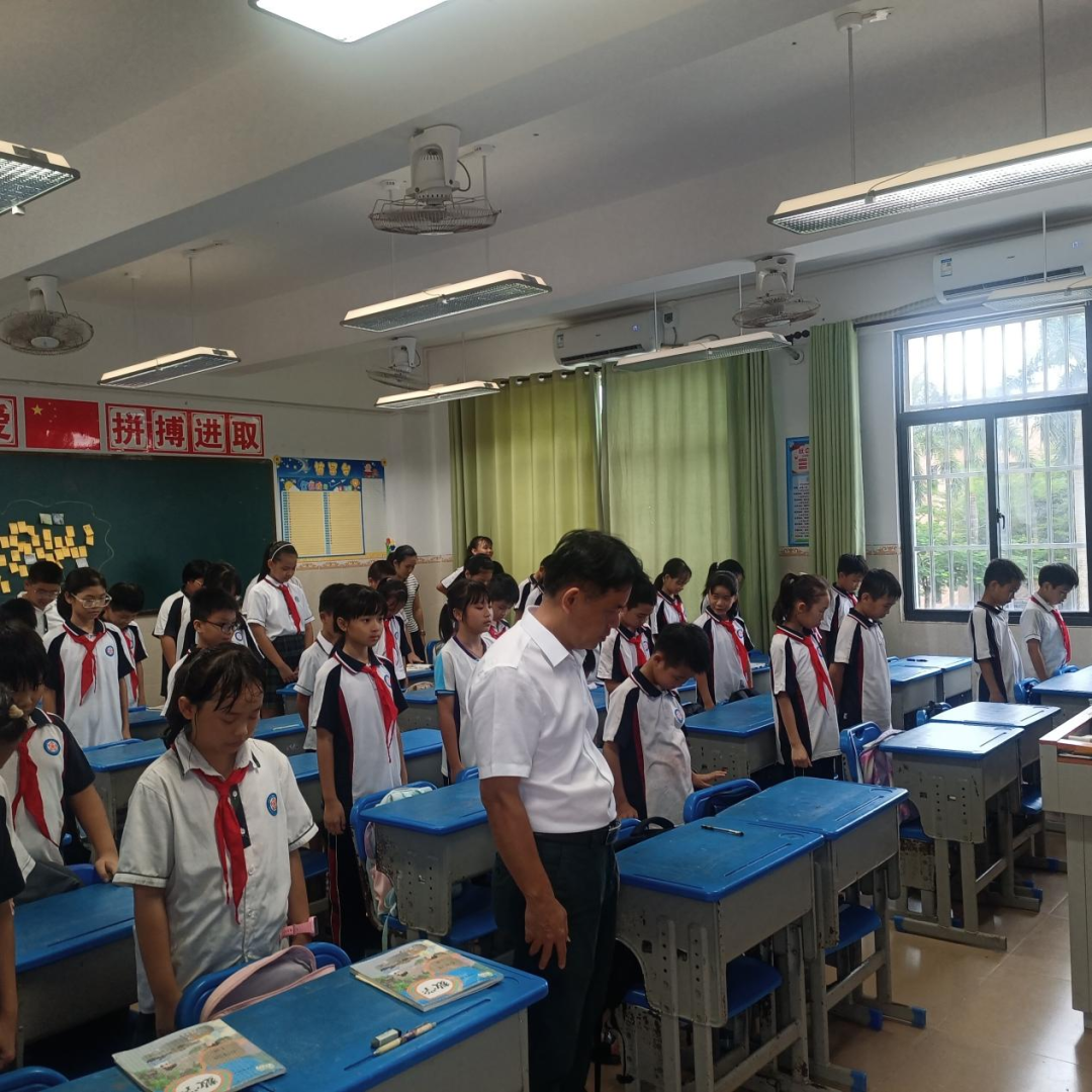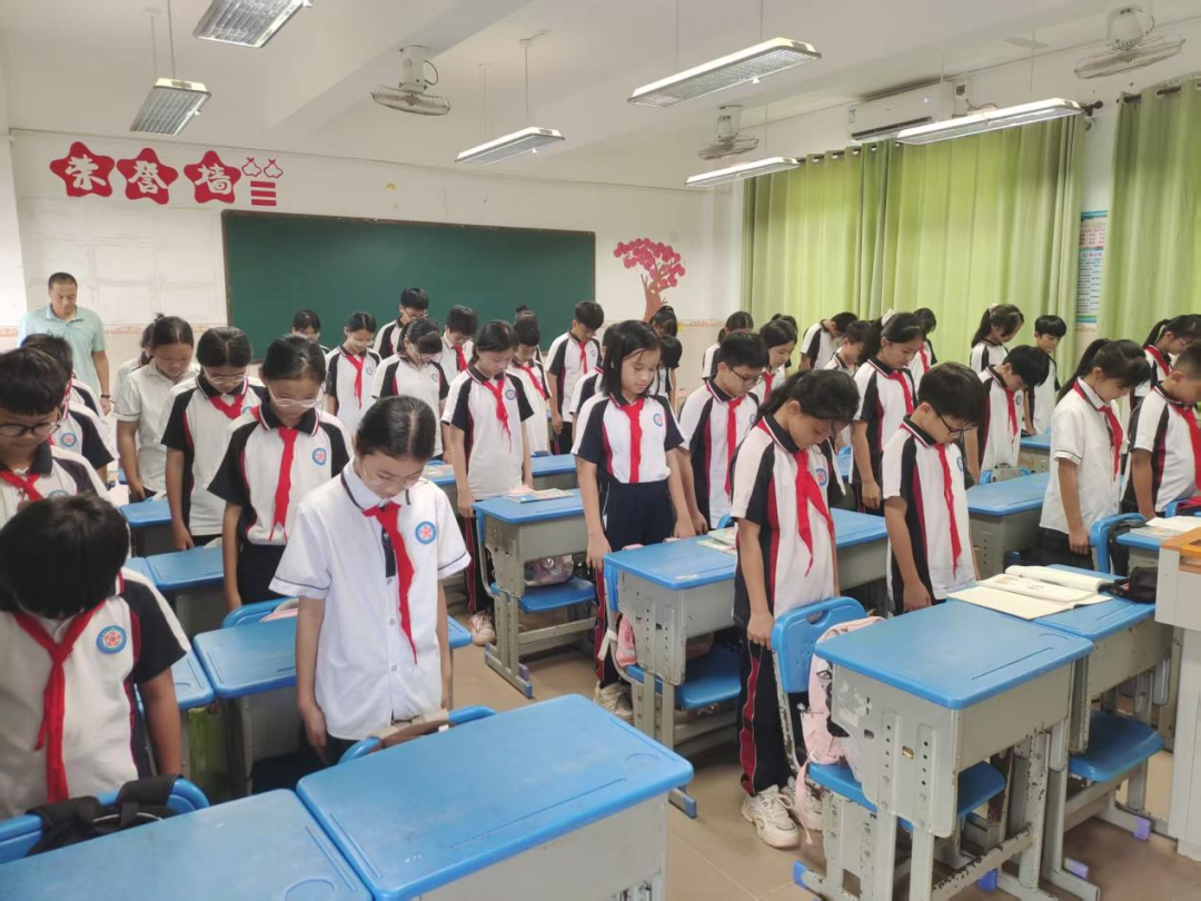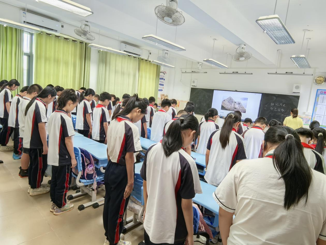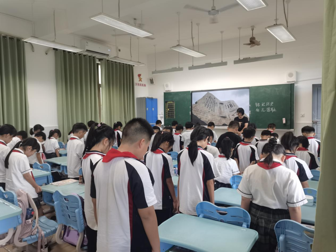 在学校德育处的统一组织下,全体师生肃立默哀,共同追忆那段饱含民族苦难与抗争的历史。默哀仪式庄严肃穆,师生神情凝重,表达对逝去英烈的深切哀悼和崇高敬意。这一刻,无声的誓言在校园中回荡:勿忘国耻,吾辈自强。