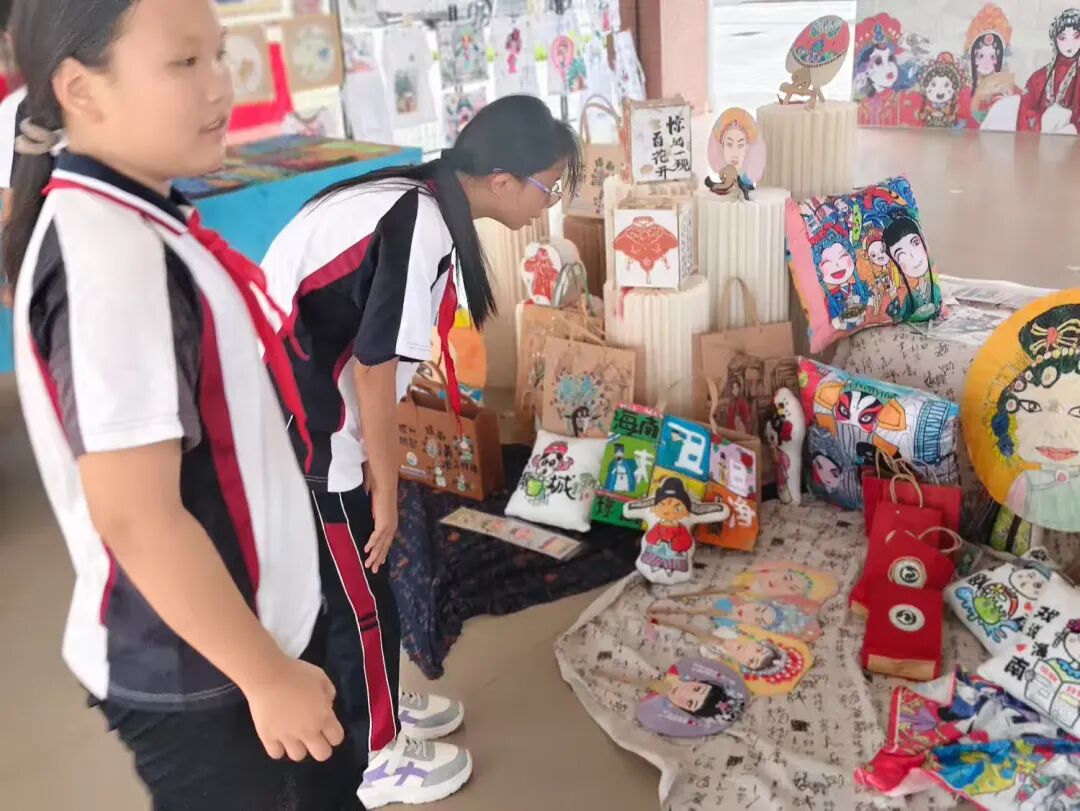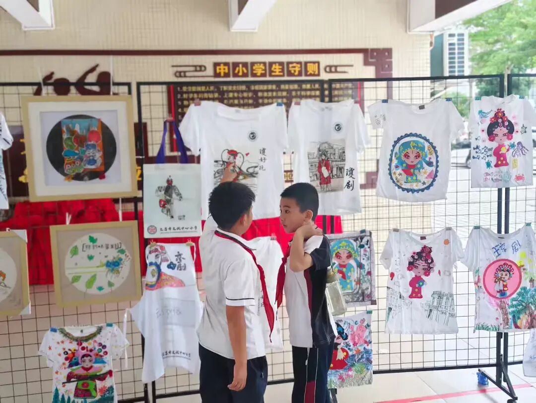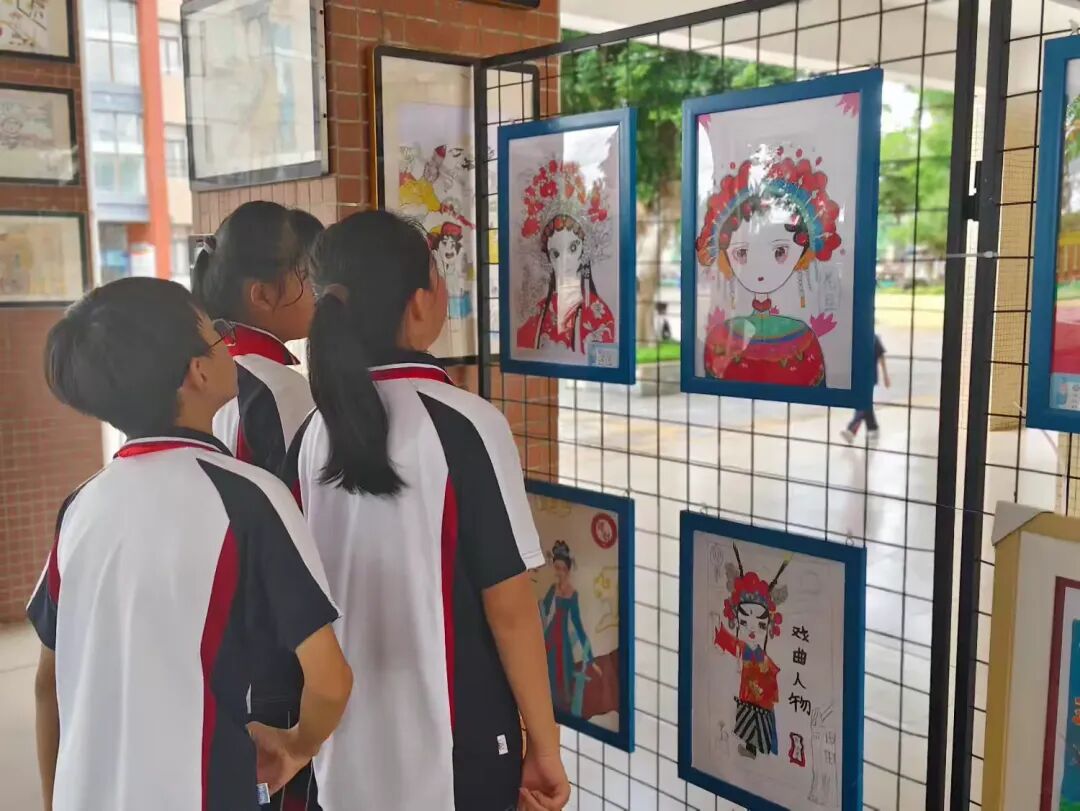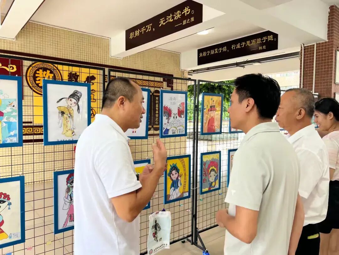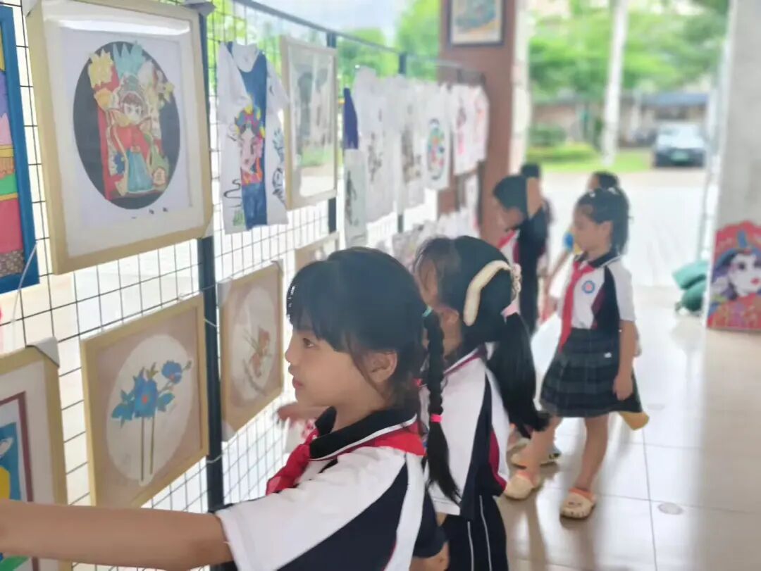 19日上午,同步开启的联合画展,成为本次活动的“视觉亮点”。画展集中展示了文昌市文城中心小学与海口市美兰区多所学校学生的琼剧主题美术作品,涵盖水彩画、剪纸、脸谱设计、文创产品等多种形式。我校学生以“文昌元素+琼剧角色”为创意核心,有的画“穿着琼剧戏服的文昌娃娃”,有的呈现“琼剧剧情里的文昌风光”,每一幅作品都充满童真与创意,既是对琼剧文化的解读,也是对本土文化的热爱。
