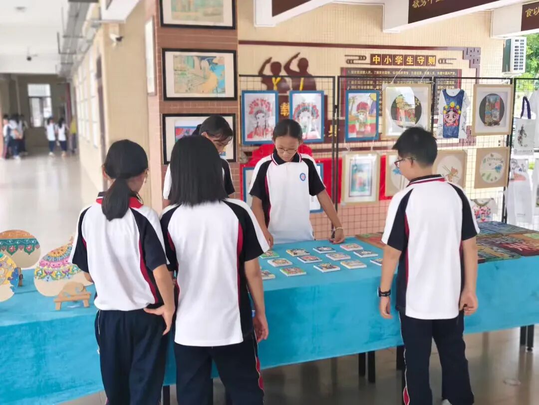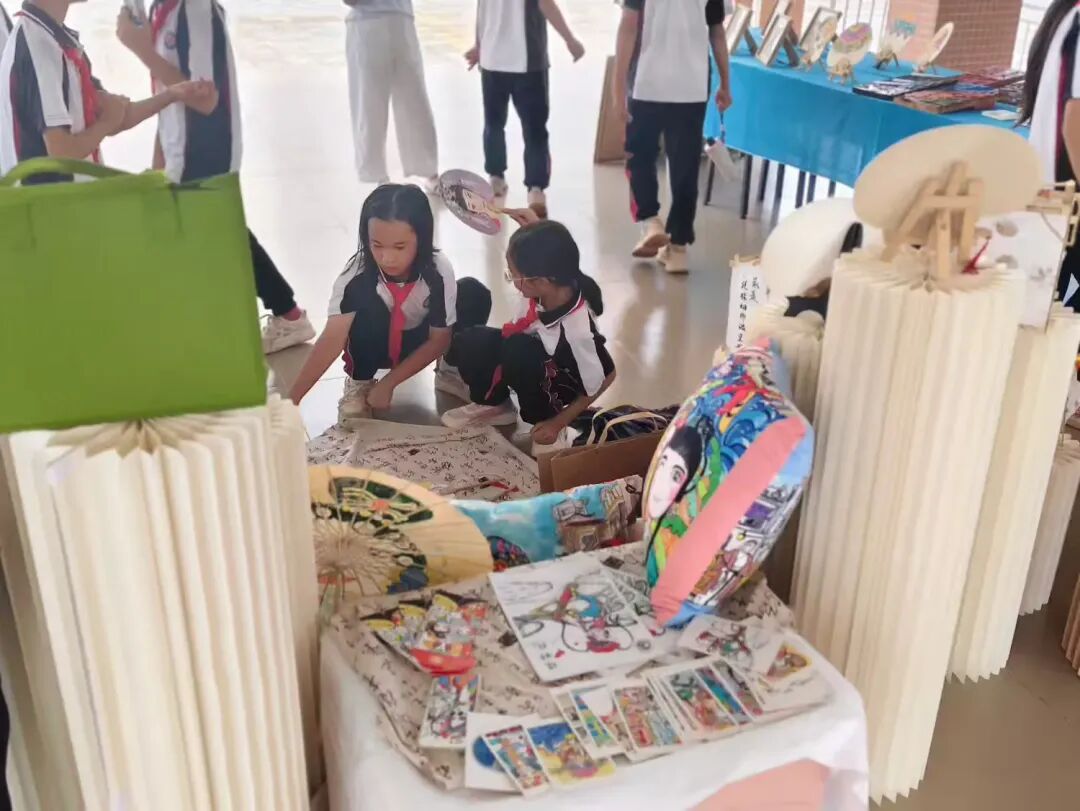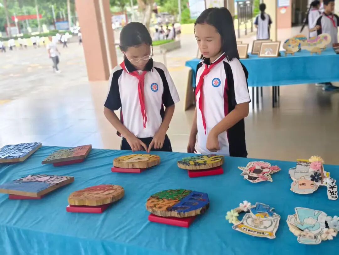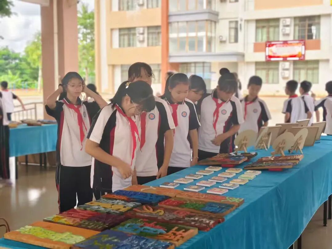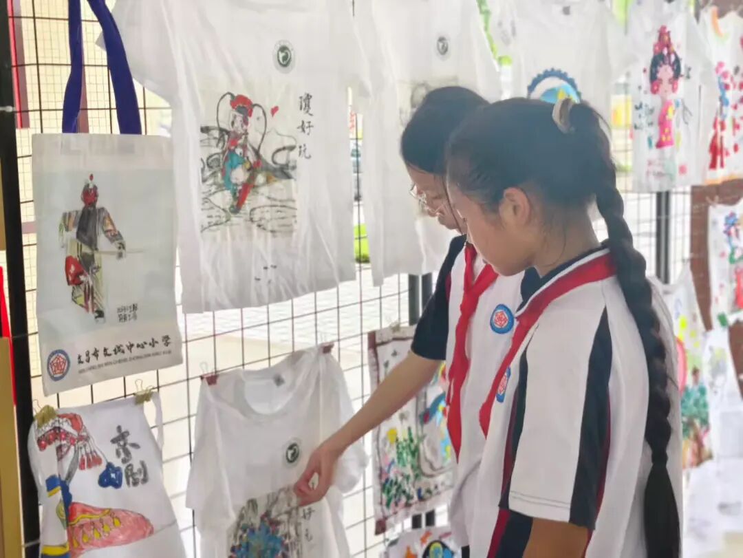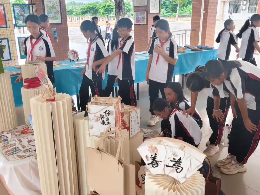 19日上午,同步开启的联合画展,成为本次活动的“视觉亮点”。画展集中展示了文昌市文城中心小学与海口市美兰区多所学校学生的琼剧主题美术作品,涵盖水彩画、剪纸、脸谱设计、文创产品等多种形式。我校学生以“文昌元素+琼剧角色”为创意核心,有的画“穿着琼剧戏服的文昌娃娃”,有的呈现“琼剧剧情里的文昌风光”,每一幅作品都充满童真与创意,既是对琼剧文化的解读,也是对本土文化的热爱。
