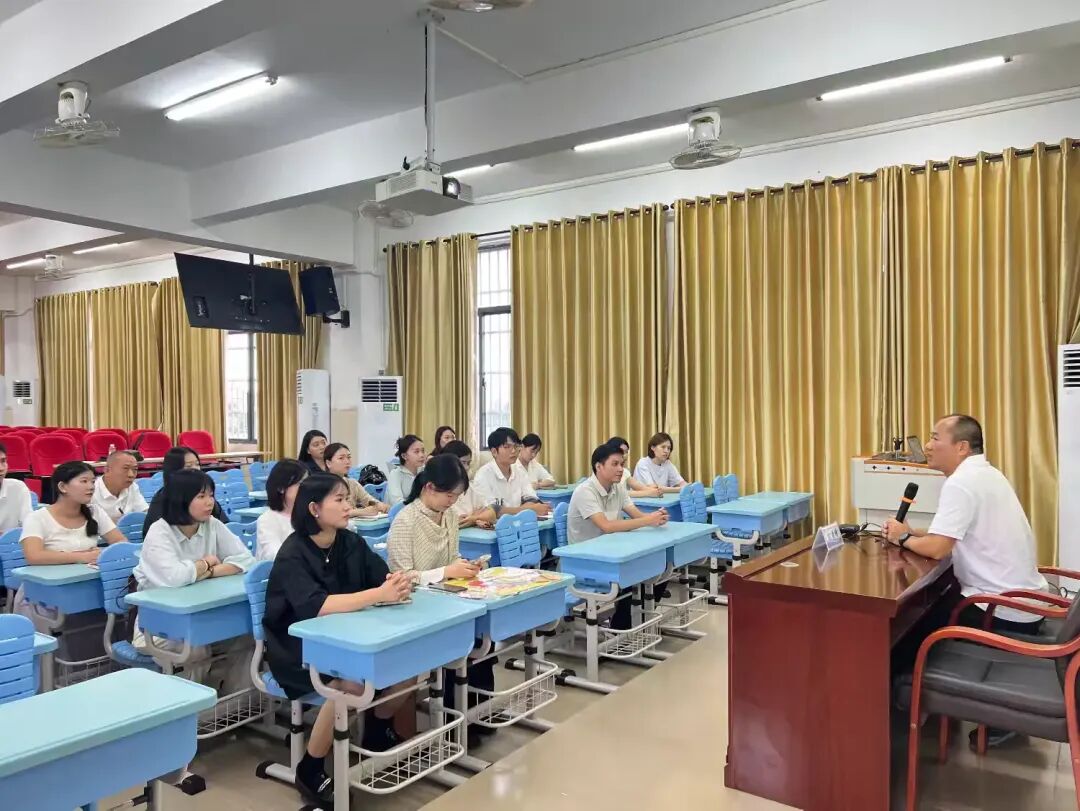 示范课结束后,海口市美兰区美术教研员陈孝峰便以琼剧经典剧目的视觉元素为引。他用一张张鲜活的图片、一个个生动的案例,将琼剧美术的核心内涵娓娓道来:色彩浓烈的脸谱纹饰、绣工精巧的戏服纹样、虚实相生的舞台布景、寓意鲜明的道具设计。层层深入的讲解,让在场教师对琼剧美术有了条理清晰的体系化认知。
