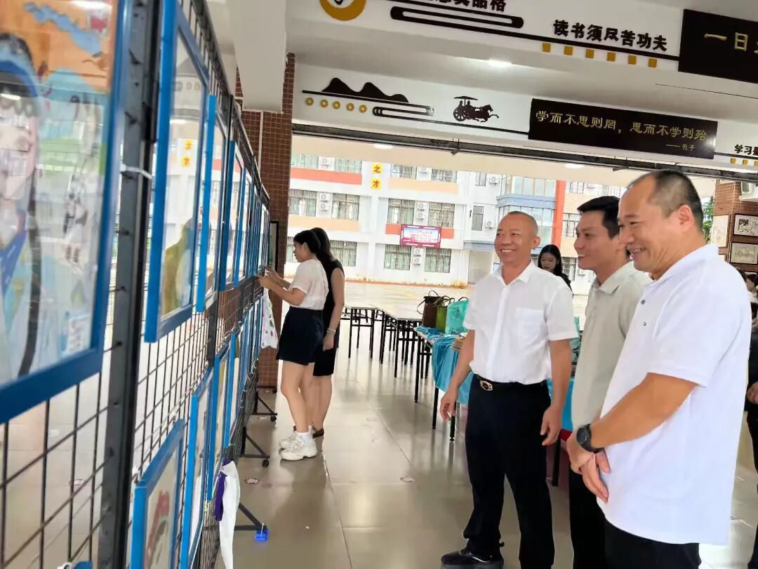画展现场,文昌市文城中心小学副校长李传文与美兰区美术教研员陈孝峰的身影格外专注。他们一同在每幅作品前驻足,时而低声交流观感,时而交换点评意见,脸上满是欣赏,频频点头称赞。