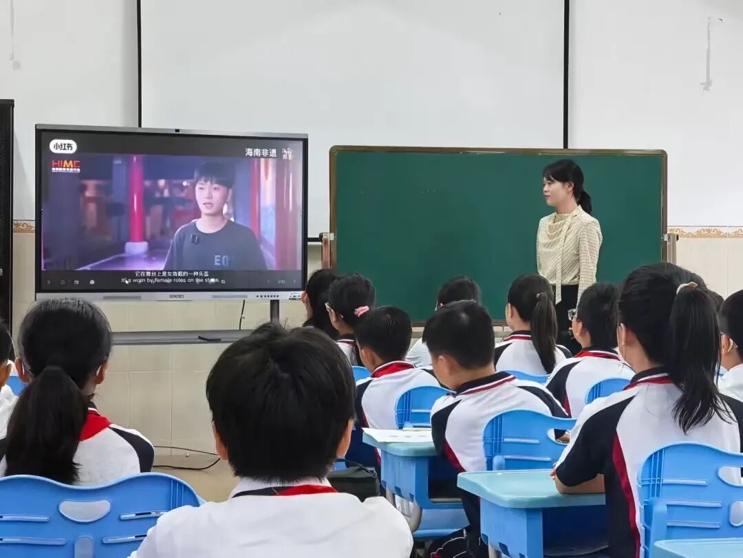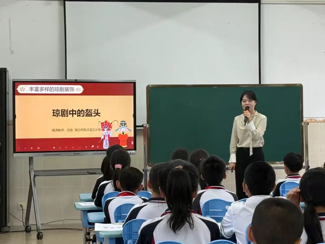 下午,来自项目团队的优秀教师——海口市英才滨江小学的沈晗老师带来生动的公开课《琼剧中的盔头》(五年级琼剧校本课程)在课堂上,教师用趣味故事讲解琼剧与地域文化的关联,再通过“教唱琼剧选段、模仿经典身段、绘制特色脸谱”三个环节,将琼剧艺术与音乐、美术学科深度融合。学生们热情高涨,在“听、唱、画”中沉浸式感受琼剧的独特魅力,原本抽象的传统艺术,变成了可触可感的课堂乐趣。