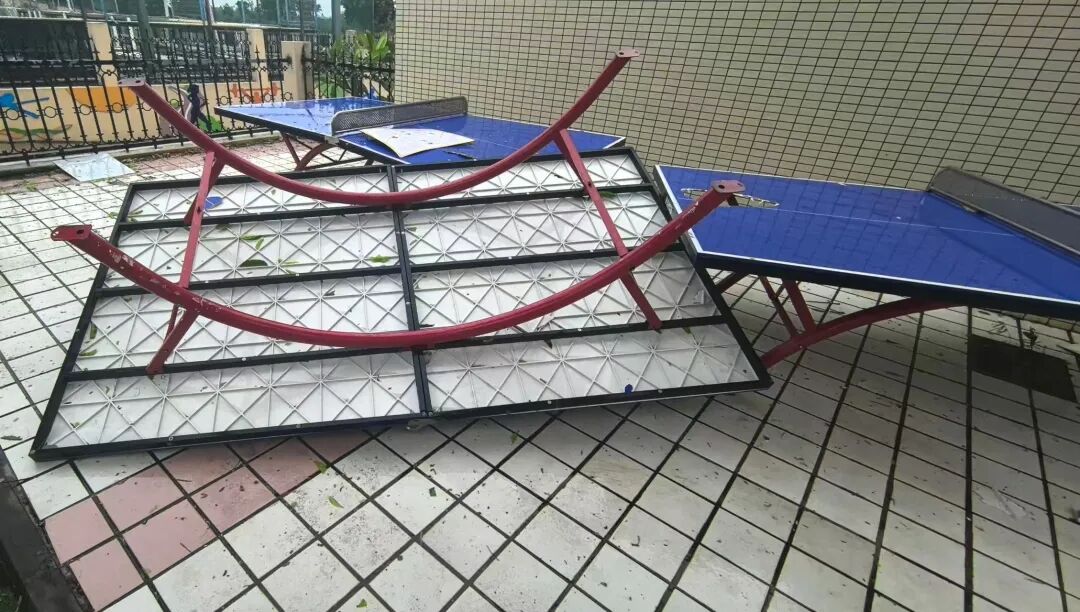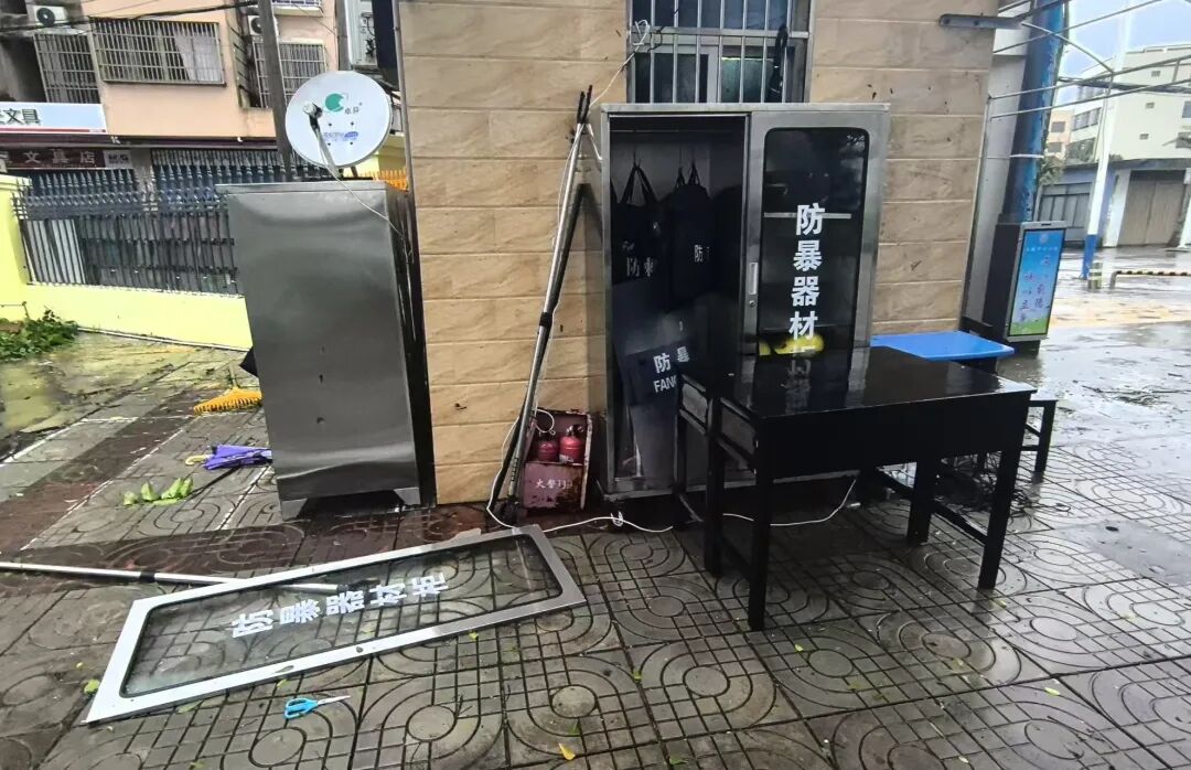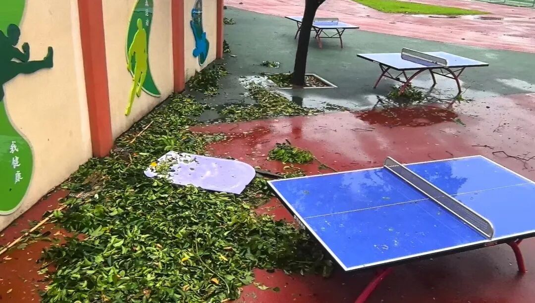 校园里,被狂风折断的树枝横亘路面,落叶与杂物铺满操场,处处是台风留下的“凌乱印记”。