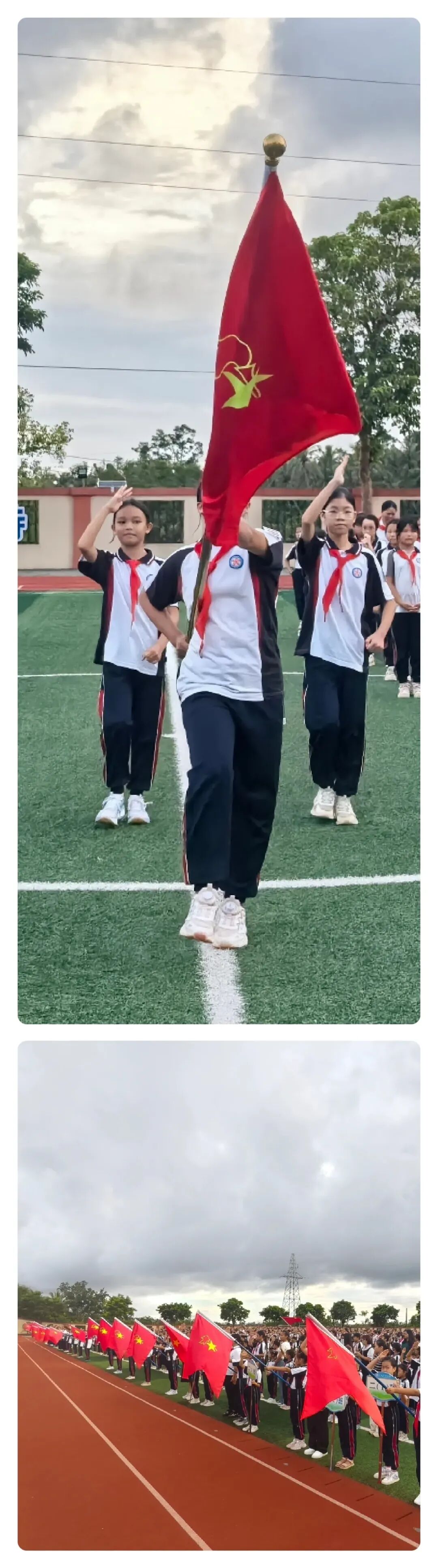 在激昂的旋律中,旗手们迈着整齐的步伐,精神饱满地走向旗台。这一刻,队旗高高飘扬,承载着我们的理想。