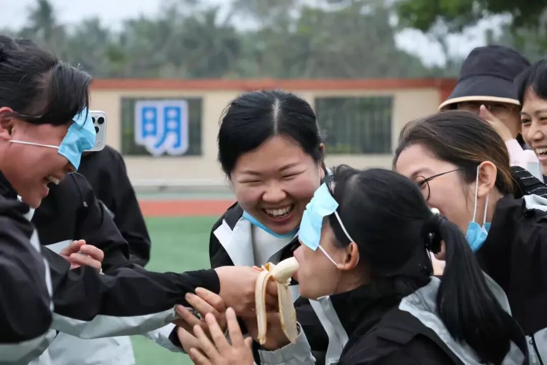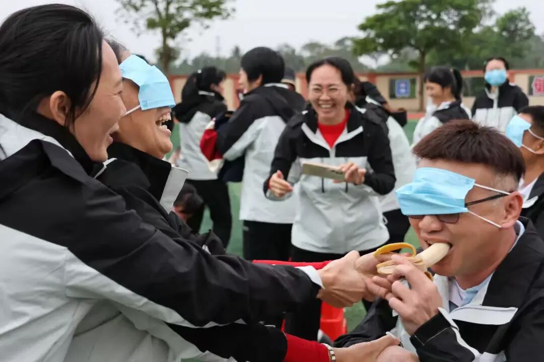 蒙眼喂香蕉项目在覃鸿剑老师的统筹下趣味十足。参赛教职工一人蒙眼,手持香蕉,在搭档的语言指引下,找准方向将香蕉喂到搭档口中。每一次精准投喂都引来现场阵阵欢呼,偶尔的“跑偏”也让大家捧腹大笑,整个过程充满了欢声笑语,充分展现了伙伴们的信任与默契。