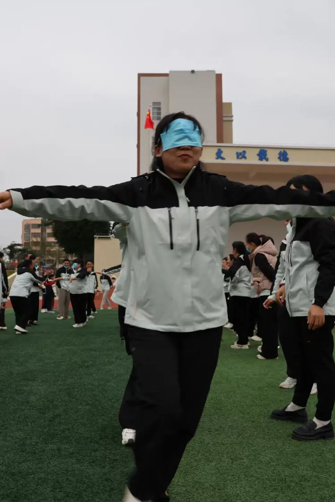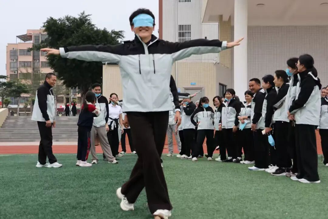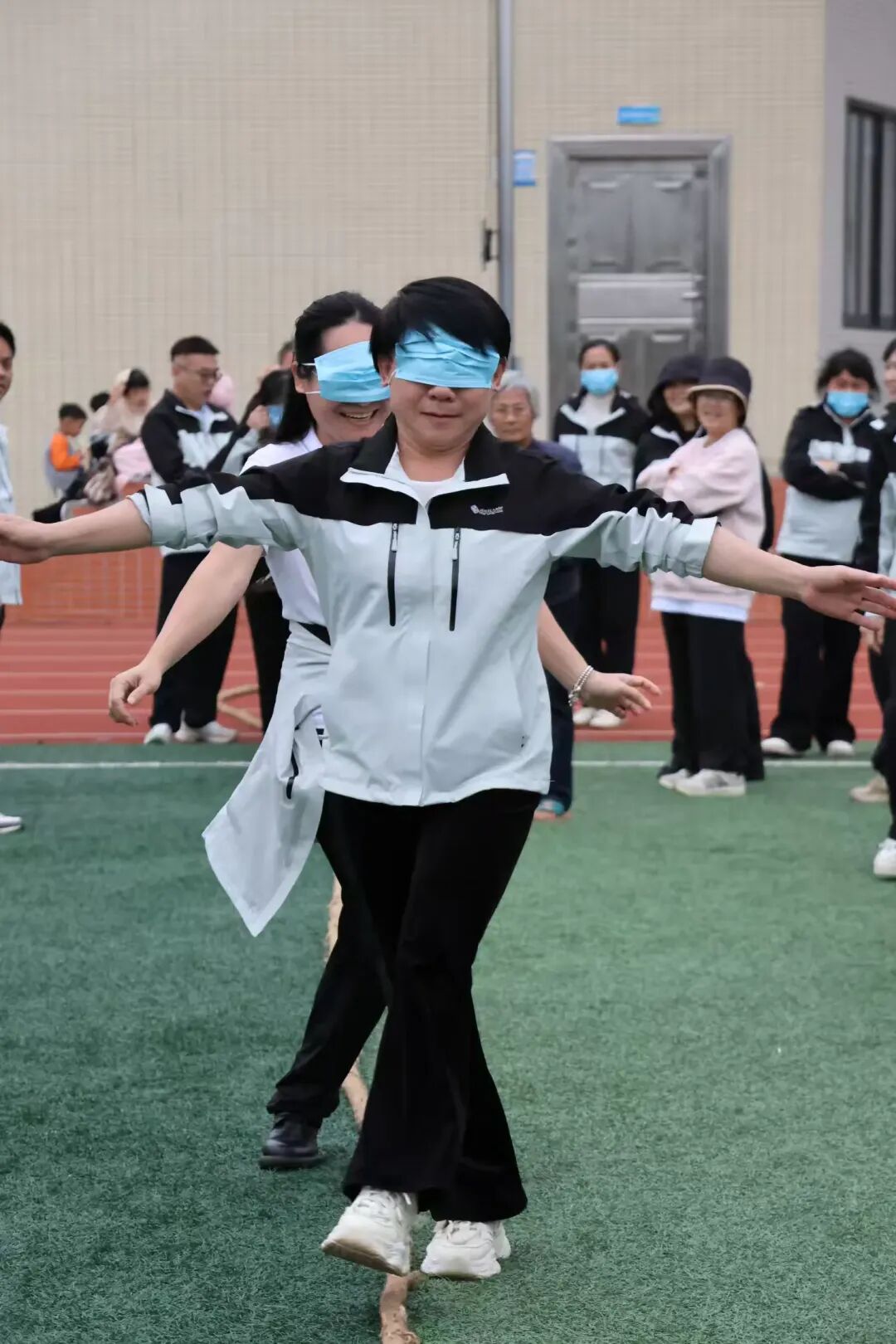 蒙眼走猫步由王堂老师负责,参赛教职工被蒙上双眼后,在指定的路线上行走,既要保持身体平衡,又要尽可能走得“优雅”。大家稳住身姿、大胆迈步,时而俏皮地调整方向,时而沉稳地向前探索,滑稽又认真的模样让现场变成了欢乐的海洋,大家的笑声和掌声不绝于耳。