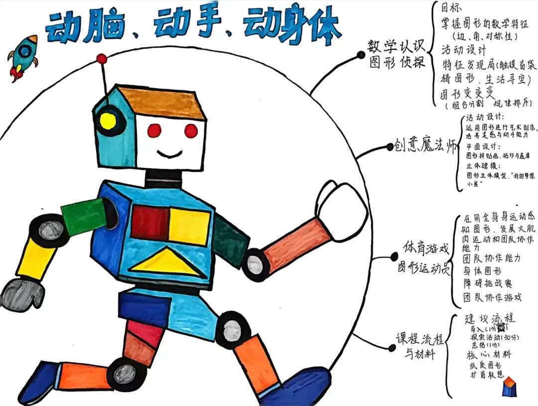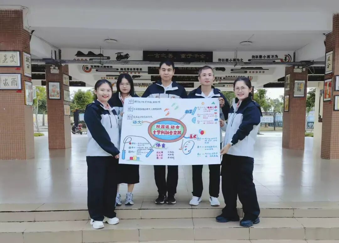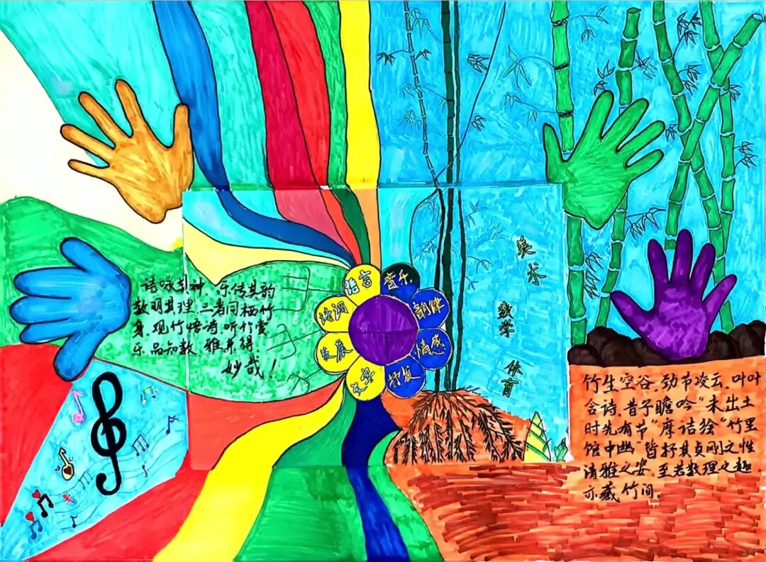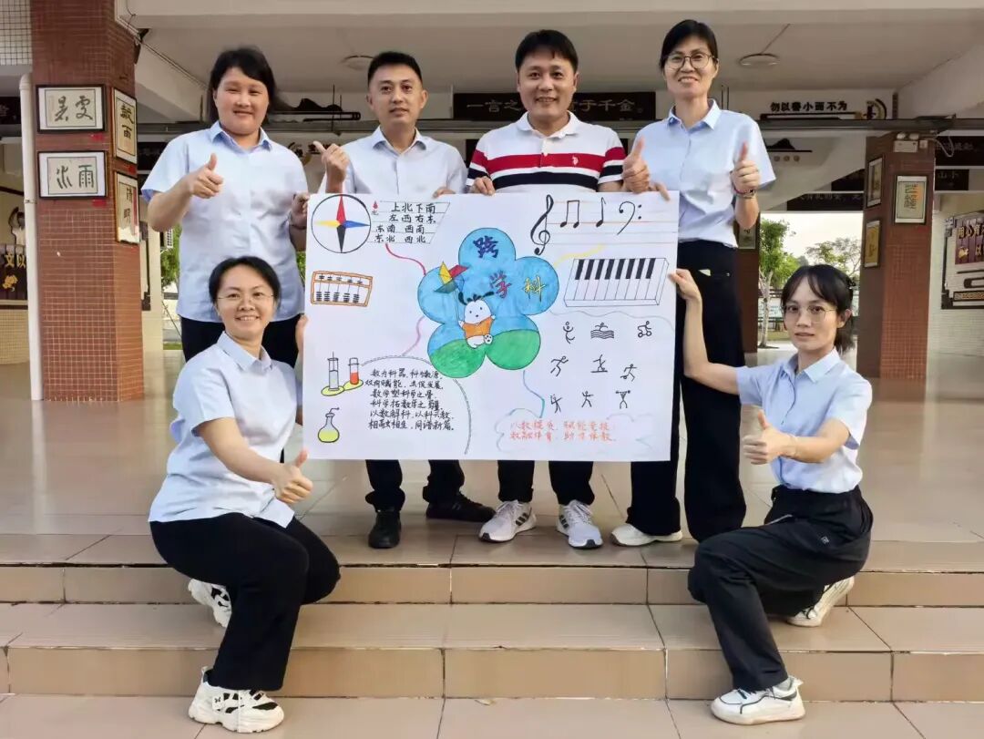 这幅充满童趣与巧思的跨学科融合主题手绘海报,它将数学、科学、体育、音乐等多学科知识与美育表达巧妙结合,清晰展现了小学阶段跨学科教学的探索成果。