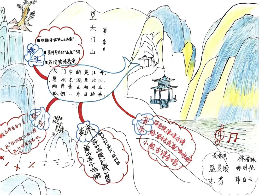 这幅作品以古诗《望天门山》为核心,串联起语文、数学、美术、音乐多学科:语文板块品读诗句、梳理意象;数学板块统计字数、绘制“诗句字数”柱状图;美术板块手绘天门山与楚江景致;音乐板块则为诗句配曲吟唱。它让诗词不再是纸上文字,而是可赏、可唱、可算的鲜活体验。