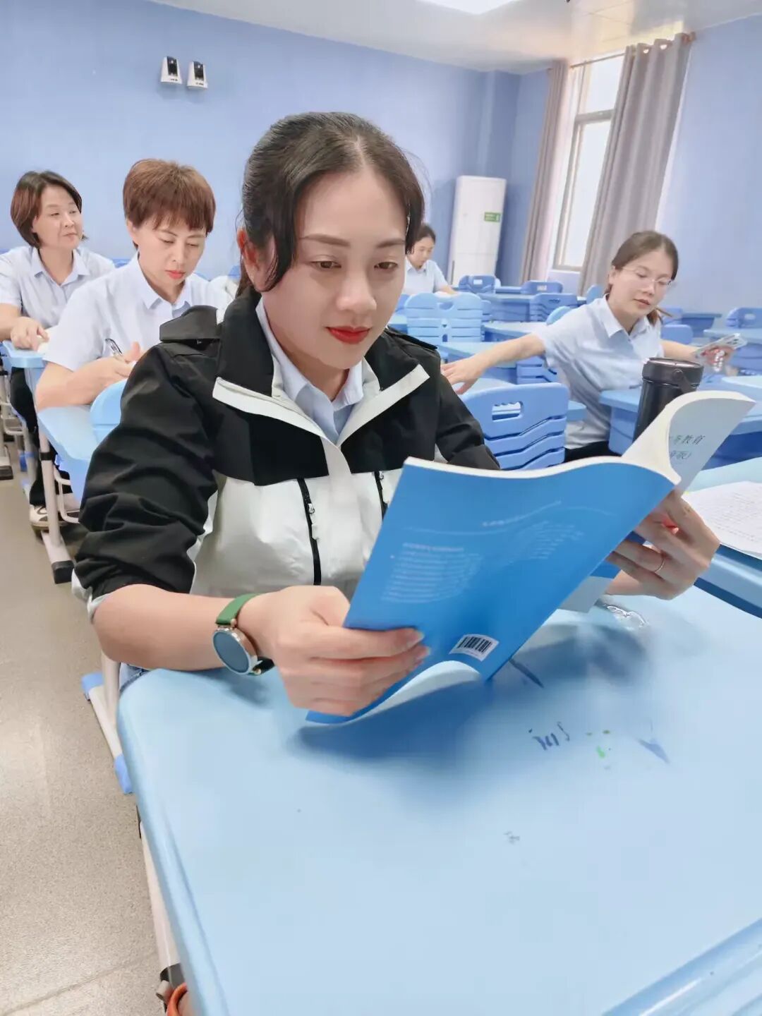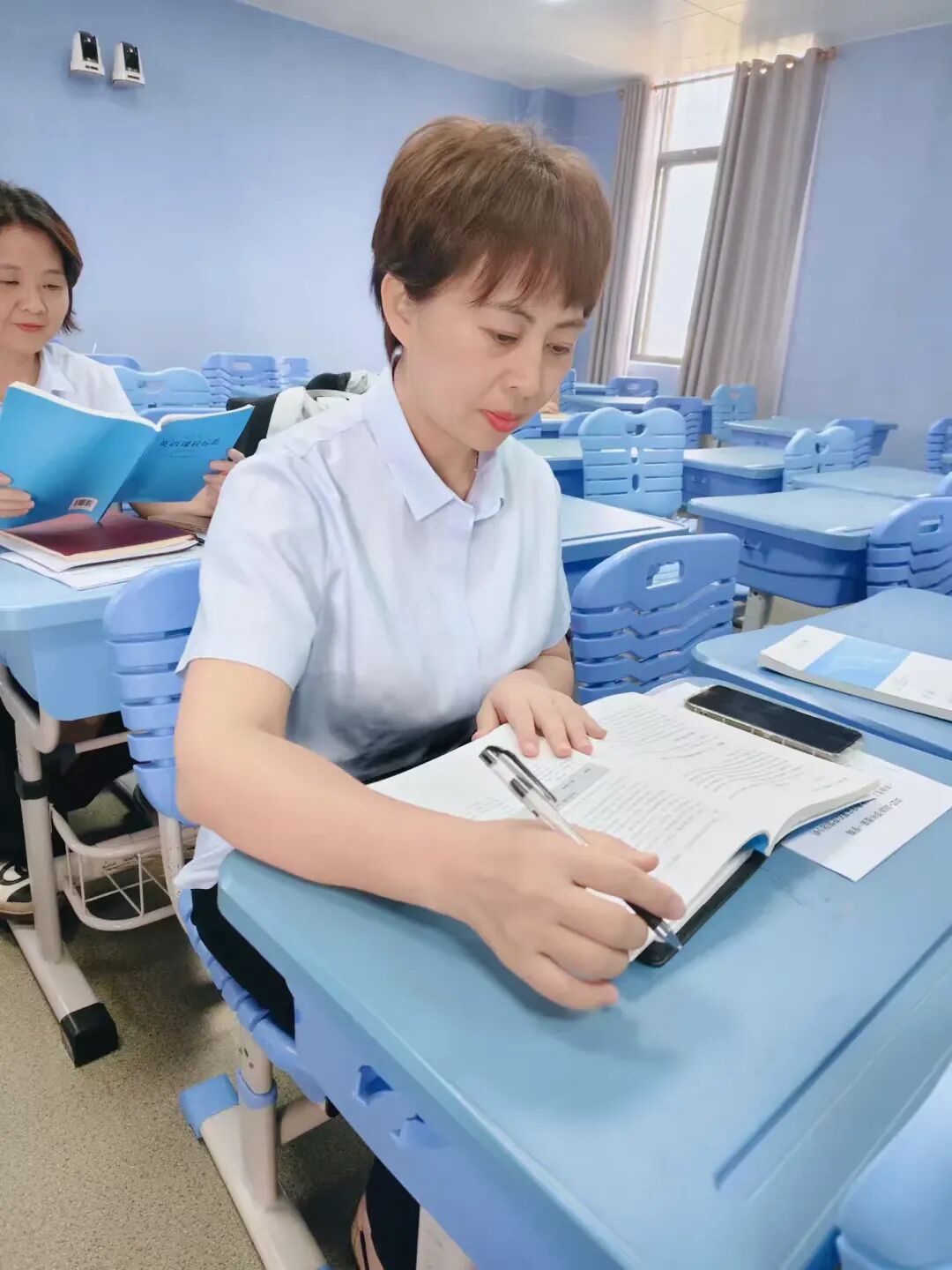 培训过程中,教师们专注投入,认真研读教材内容并结合英语课程标准,积极参与互动讨论。现场氛围浓厚,展现了教师团队对新教材学习的高度重视。