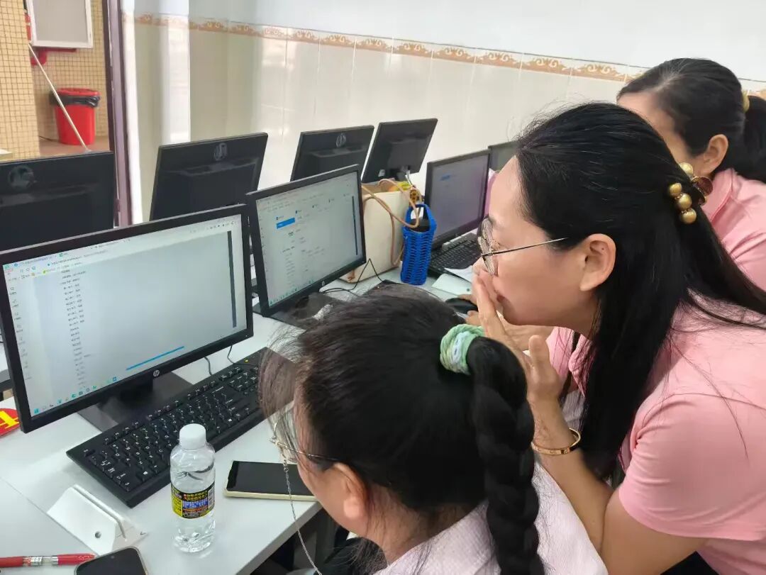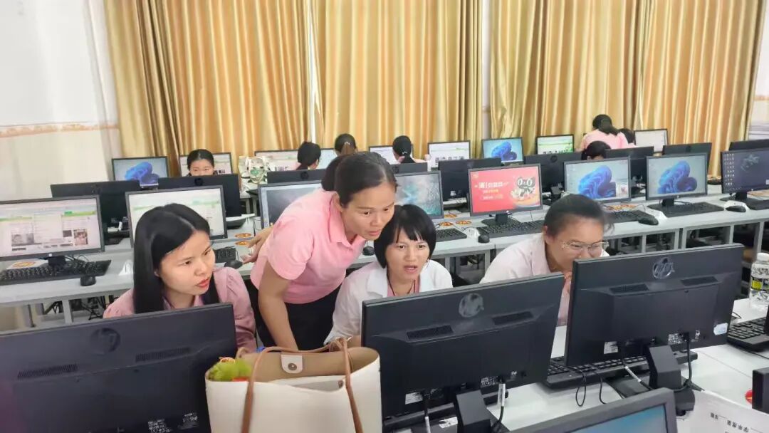 在自主练习阶段,教师们登录海南中小学智慧教育平台,借助AI工具,结合本年级教学内容尝试生成单元测试卷。吴主任和陈小燕等骨干教师等巡回指导,针对教师提出的资源筛选、题型组合等问题提供个性化解决方案。