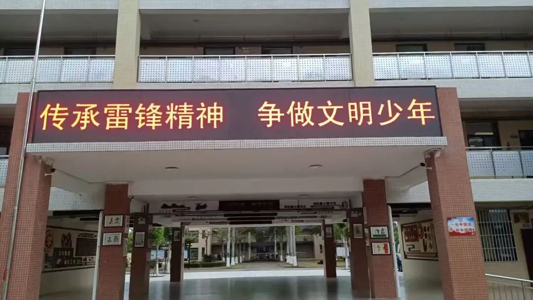 校园里,电子屏与黑板报相映成趣,生动展示着雷锋事迹与暖心标语。