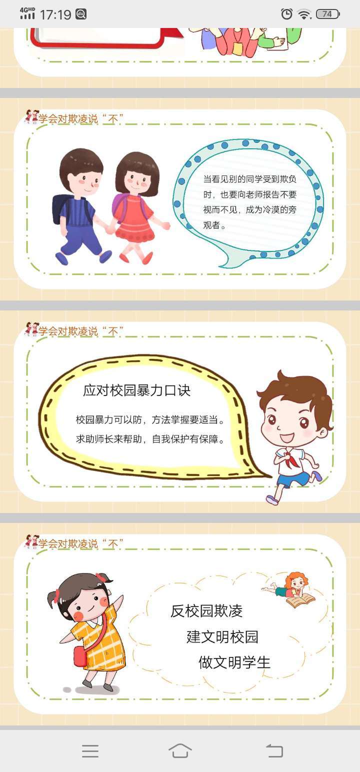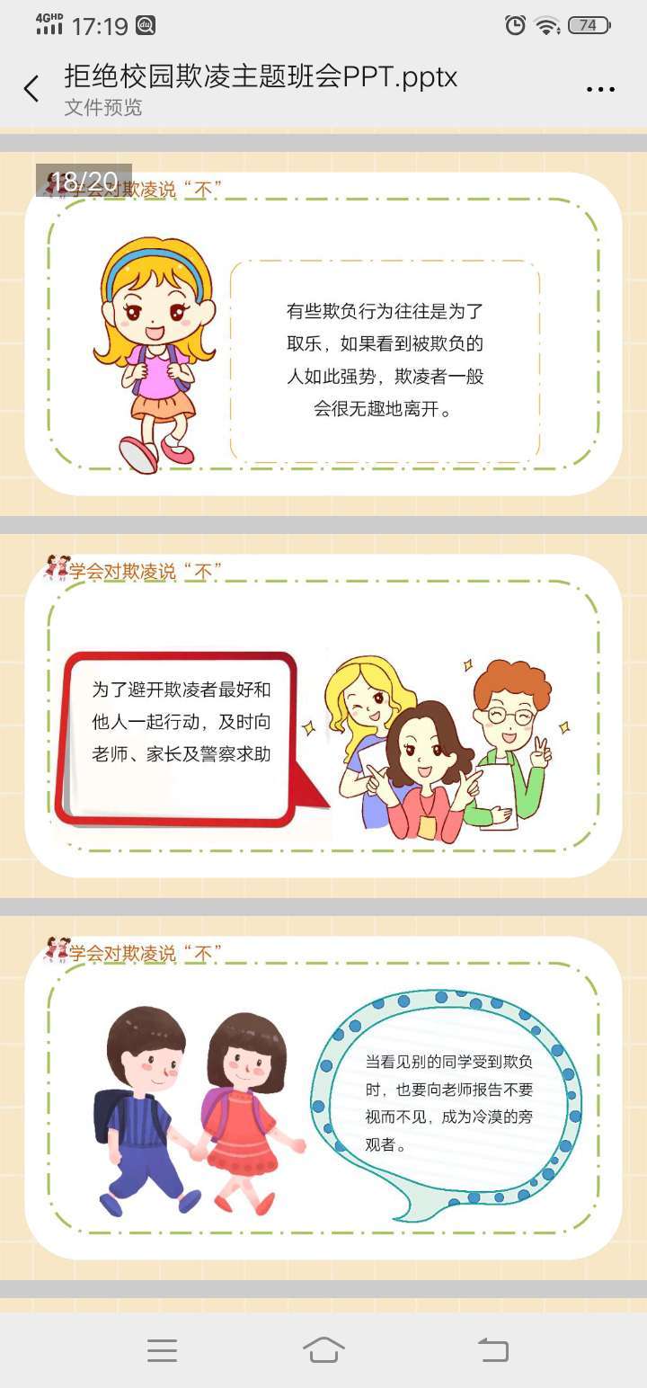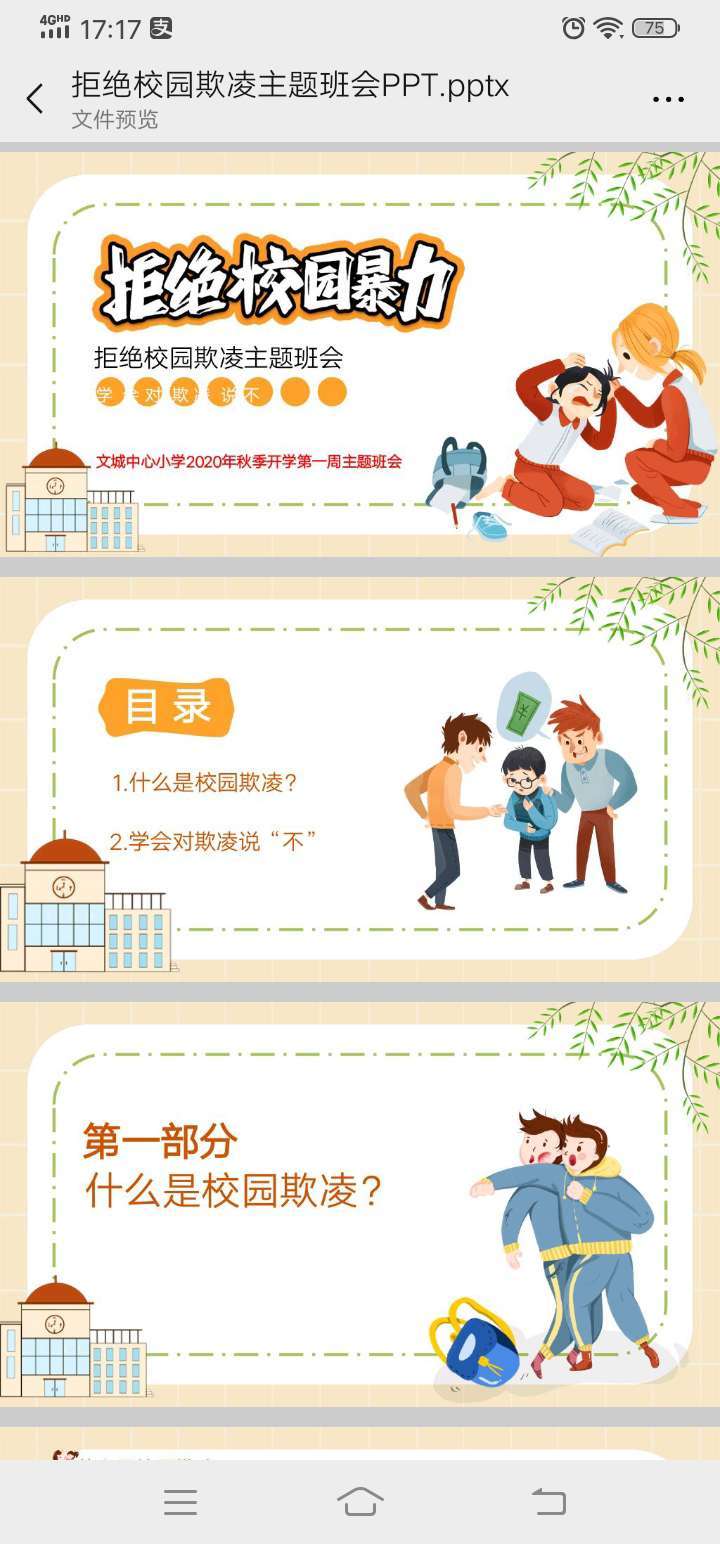 近年来,校园欺凌、暴力事件屡屡发生。学生的安全意识和法律意识薄弱。为了避免校园欺凌和暴力事件的发生,9月18日开展防校园欺凌主题班会。