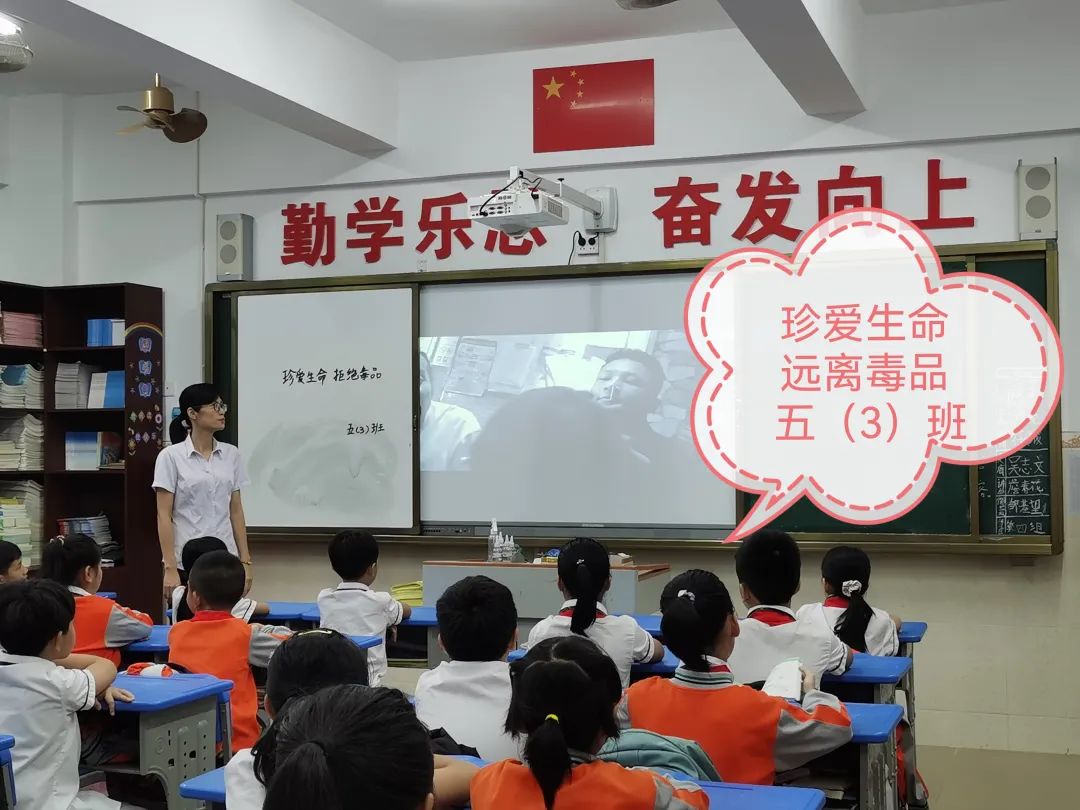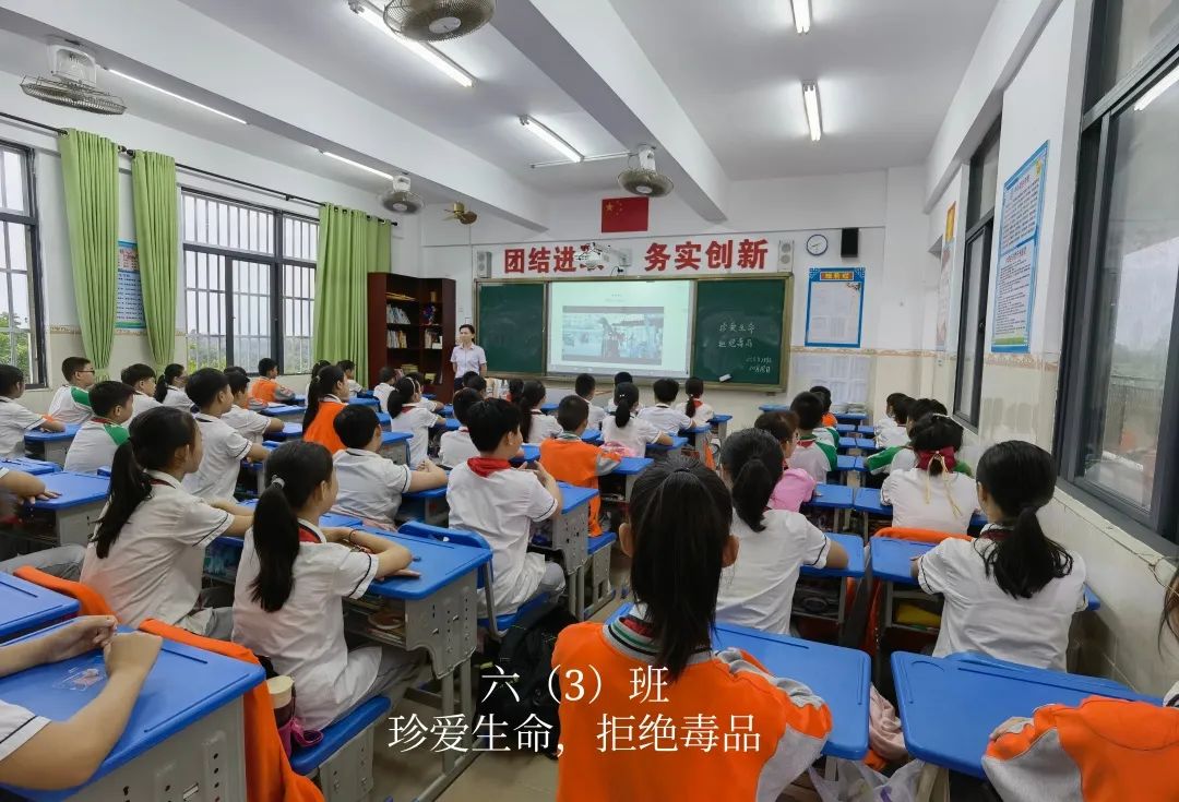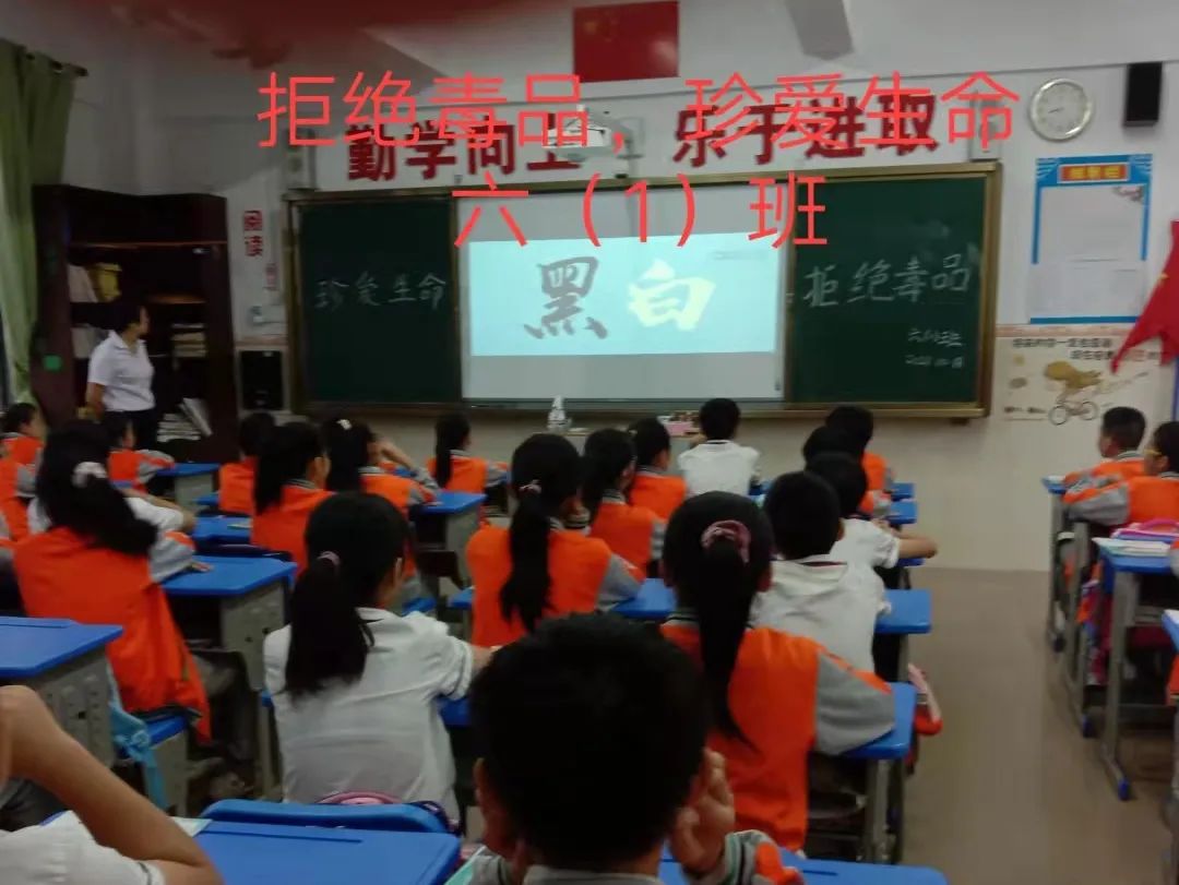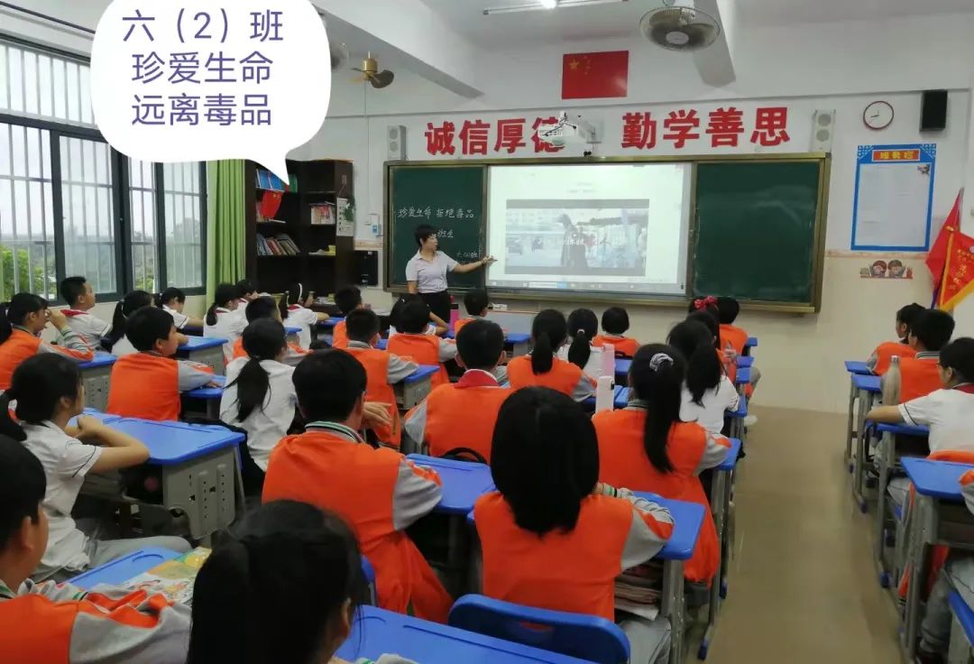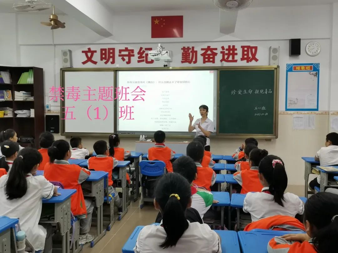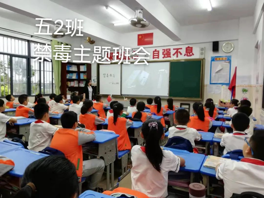 升旗仪式后,五、六年级的同学在班主任的组织下开展禁毒主题班会。